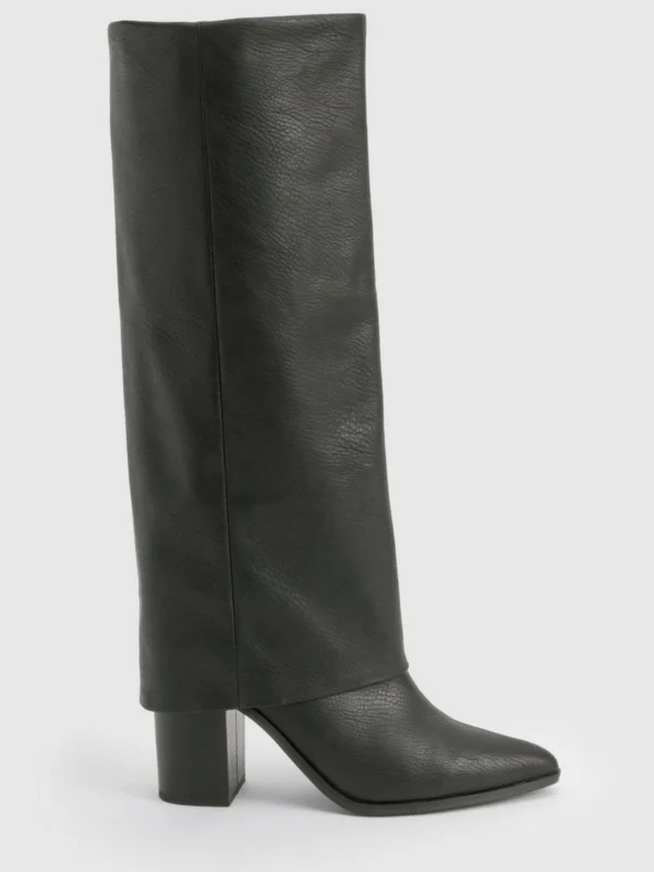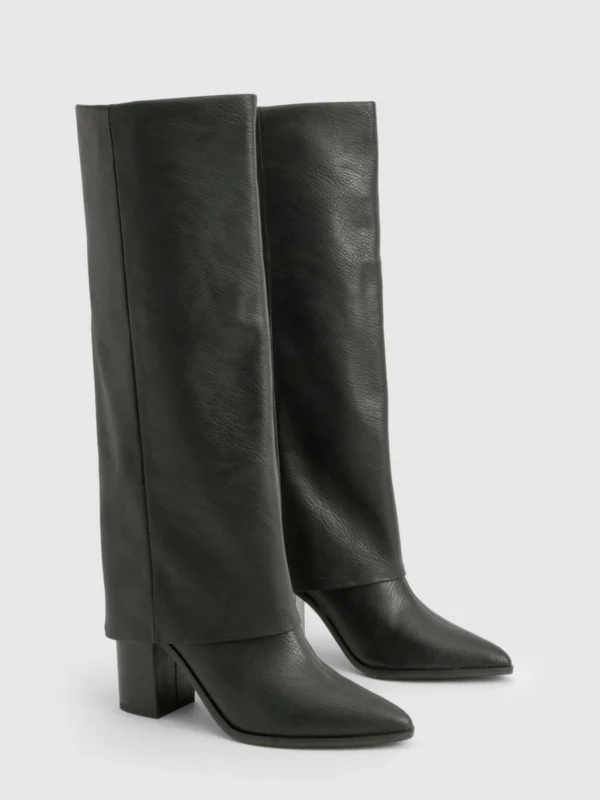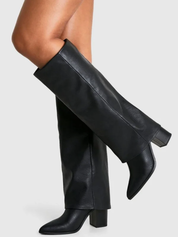 BOOHOO Textured Foldover Stacked Heel Knee High Boots
