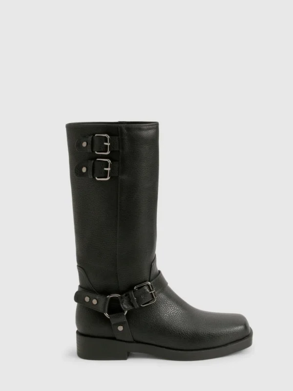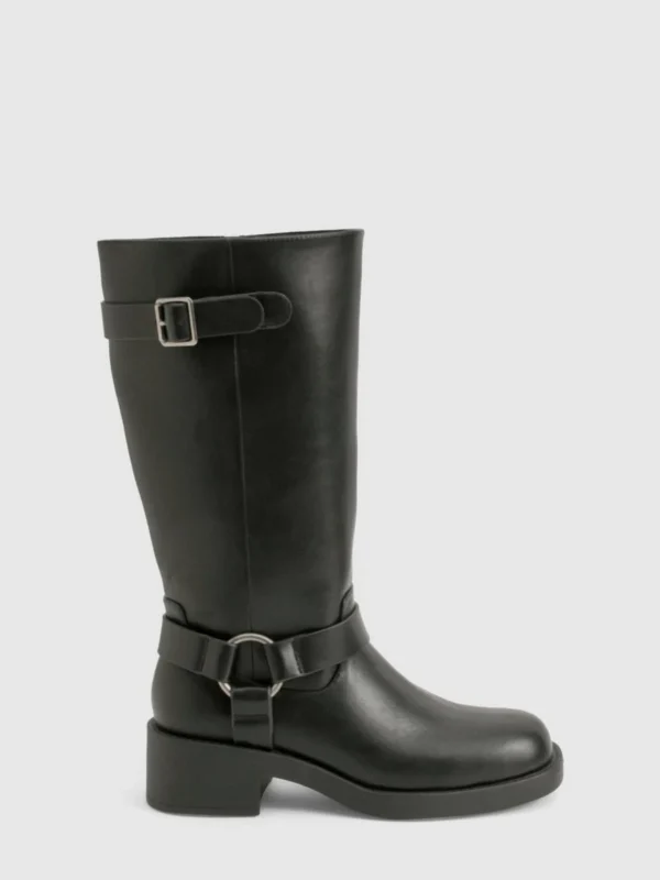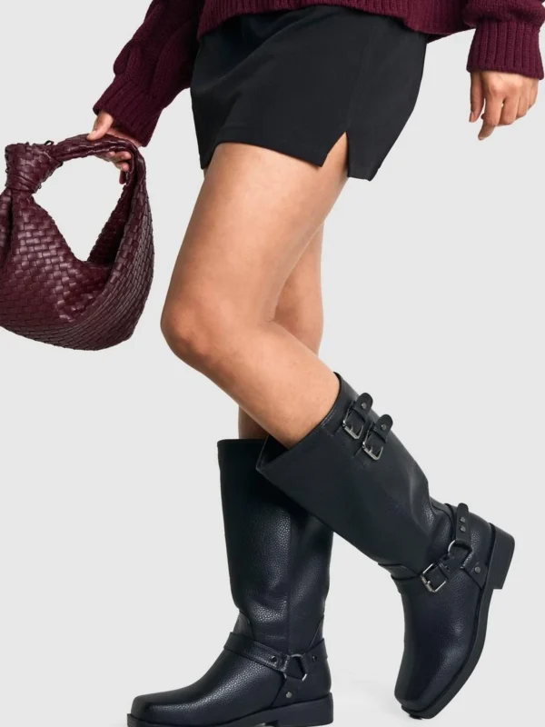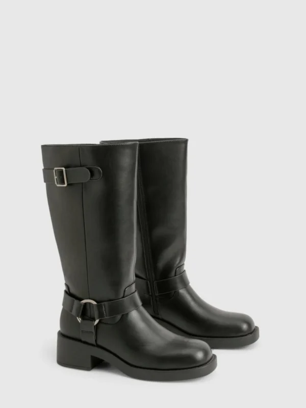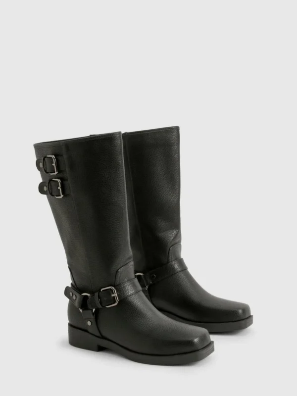 BOOHOO Textured Harness Detail Biker Knee High Boot