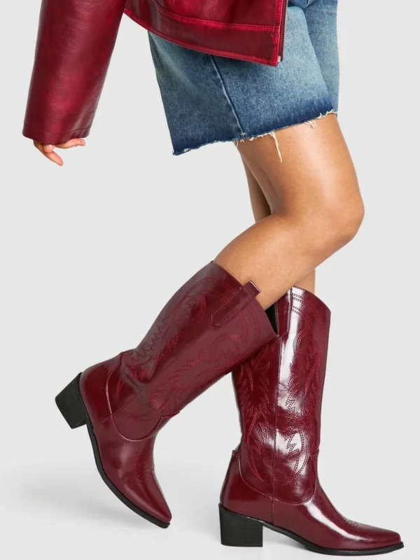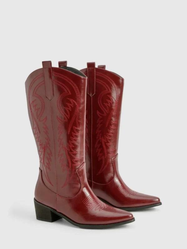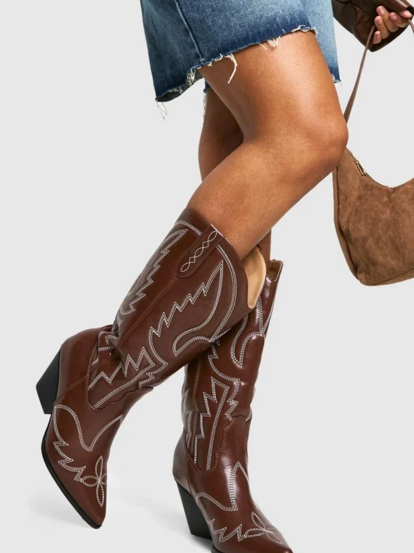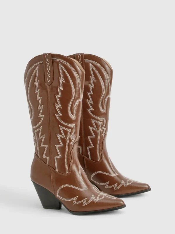 BOOHOO Vintage Look Calf Detail Embroidered Western Cowboy Boots