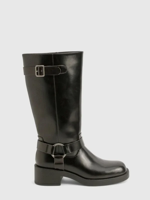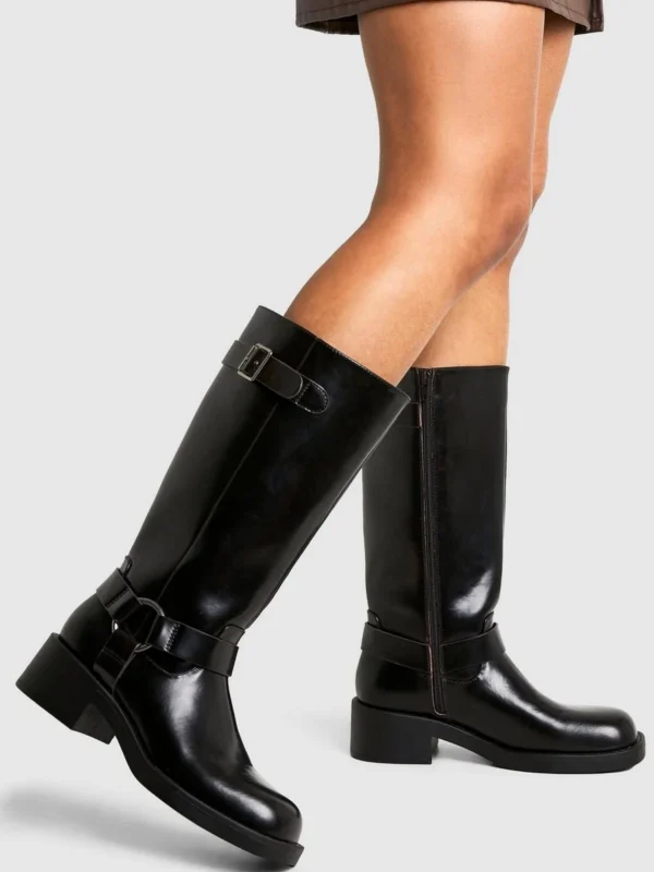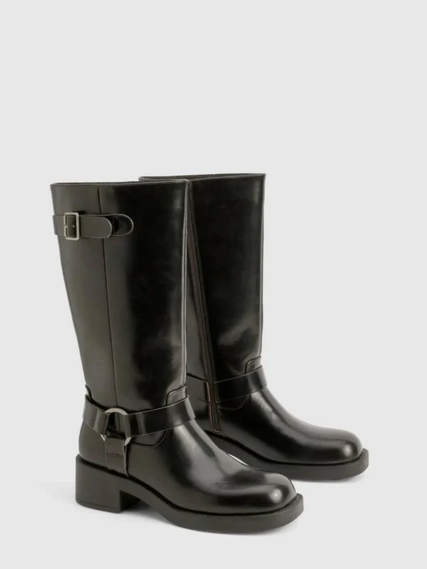 BOOHOO Vintage Look Harness Detail Biker Knee High Boot