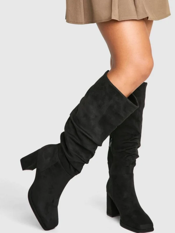 BOOHOO Wide Fit Block Heel Ruched Knee High Boot