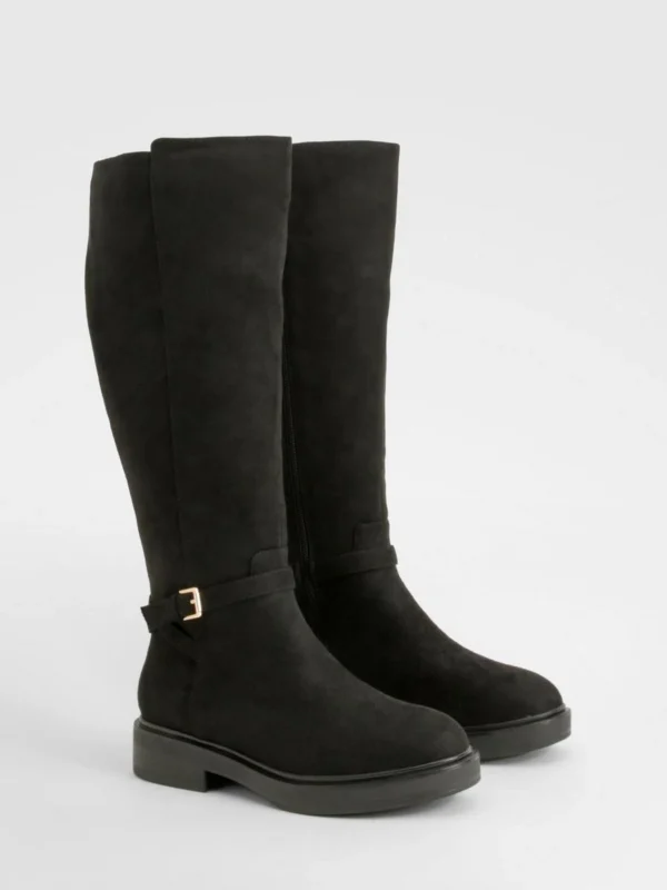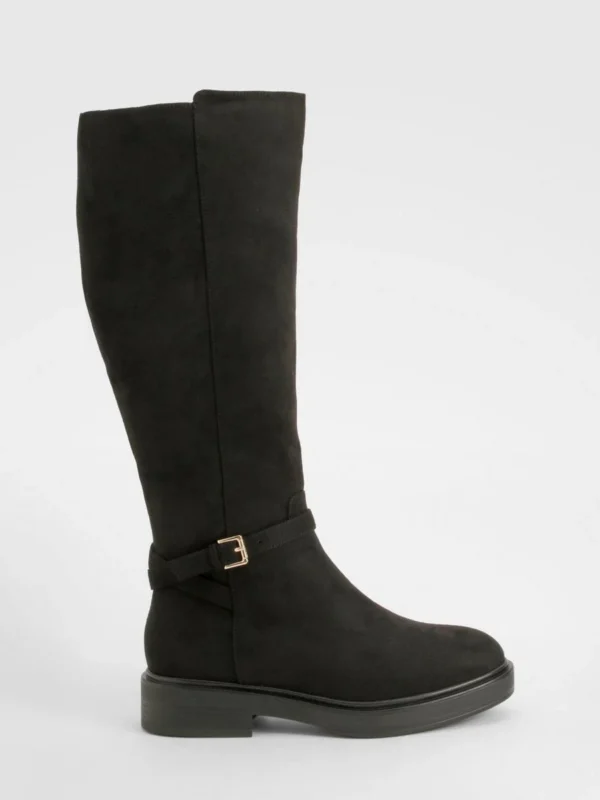 BOOHOO Wide Fit Buckle Detail Low Heel Knee High Boots