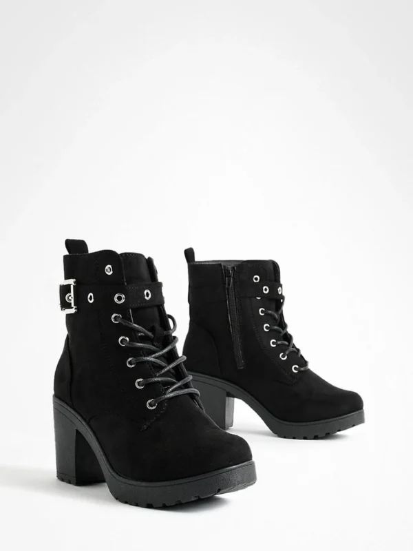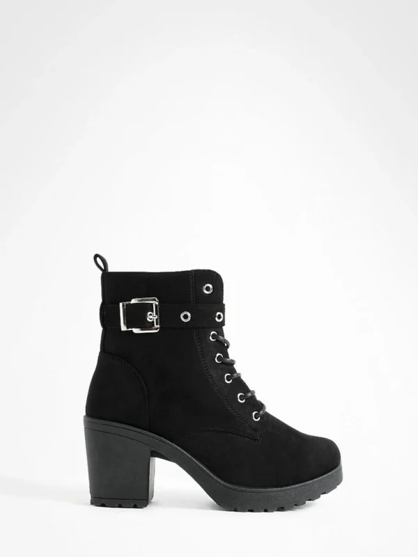BOOHOO Wide Fit Faux Suede Buckle Lace Up Chunky Hiker Boots
