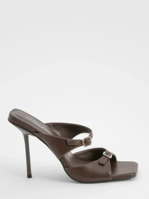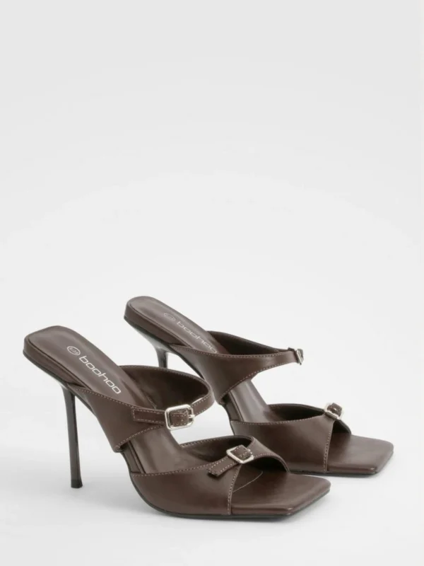 BOOHOO Double Buckle Square Toe Heeled Mules