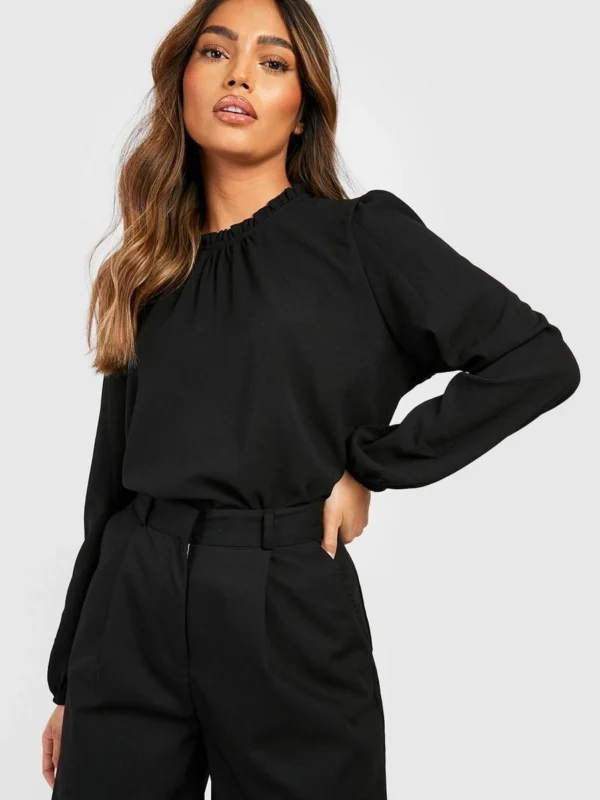 BOOHOO Black Frill Neck Long Sleeve Woven Blouse