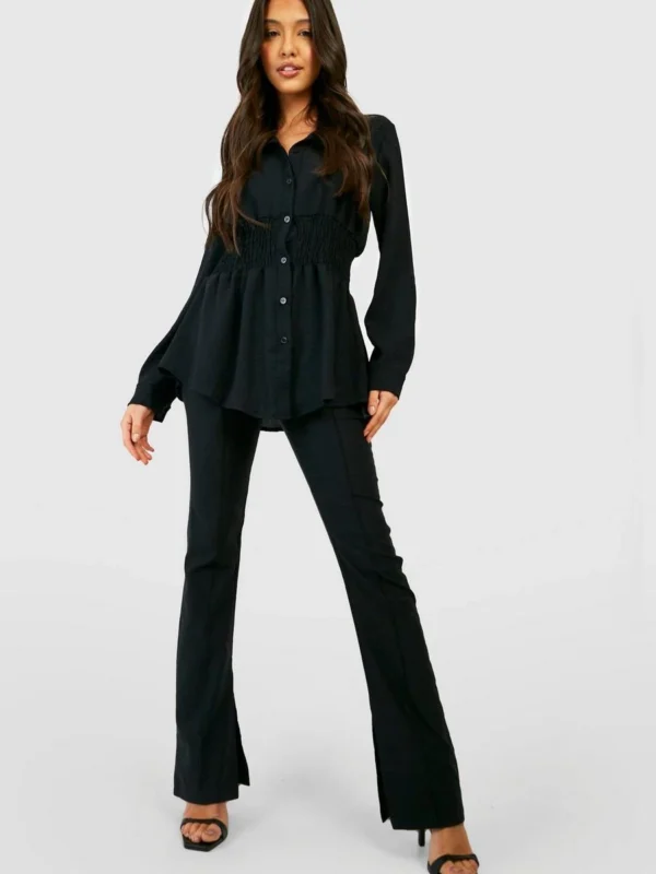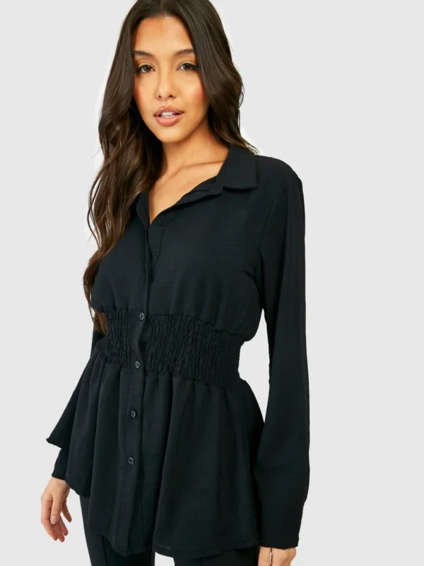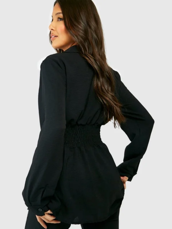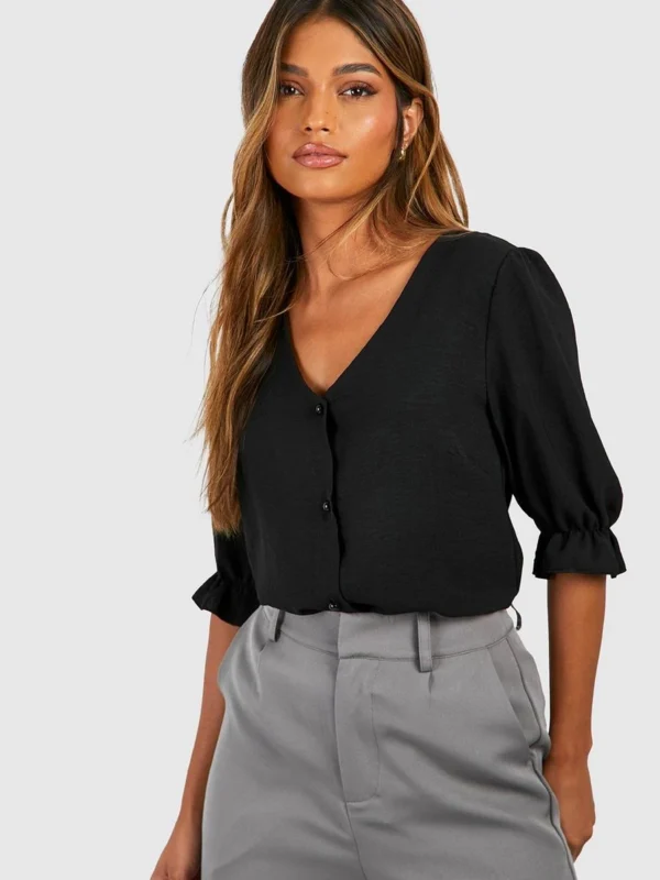 BOOHOO Black Hammered Puff Sleeve Button Front Blouse