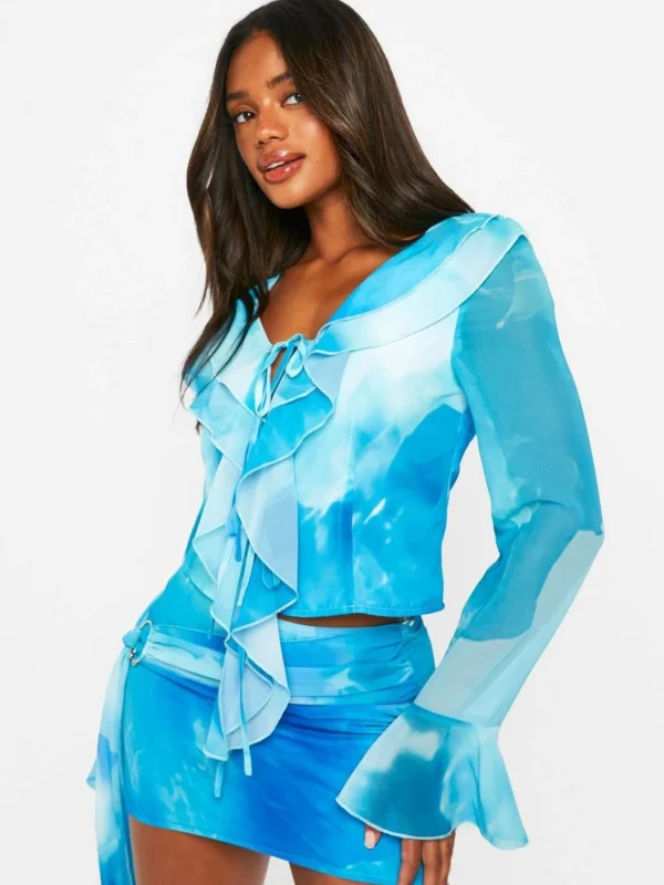 BOOHOO Abstract Chiffon Ruffle Blouse