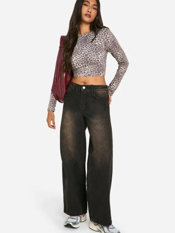 BOOHOO Basic Animal Print Cotton Long Sleeve Asymmetric Top