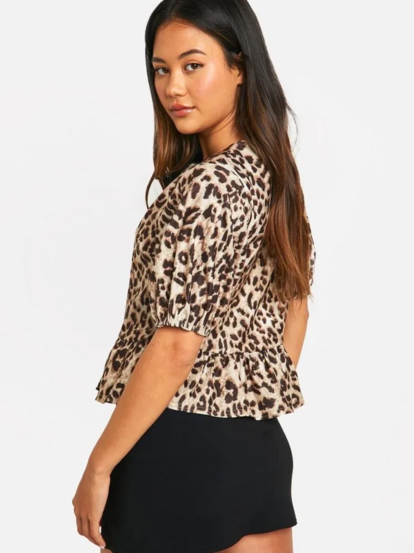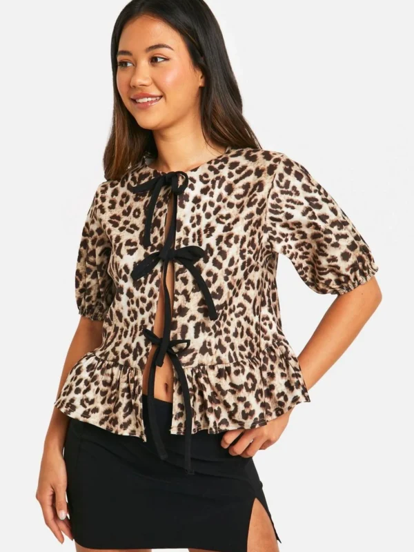 BOOHOO Bengaline Leopard Print Tie Front Smock Top