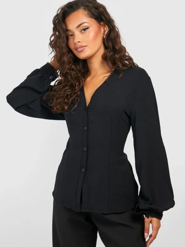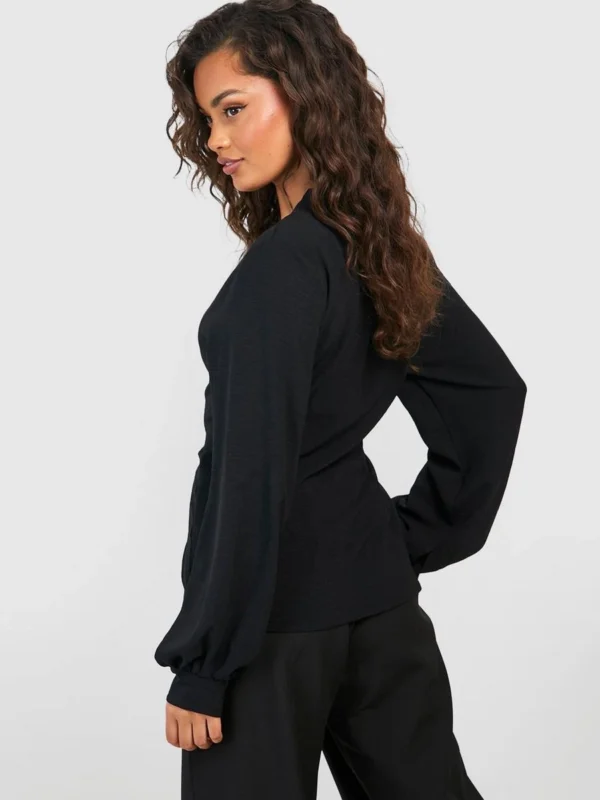 BOOHOO Black Hammered Volume Sleeve Fitted Blouse