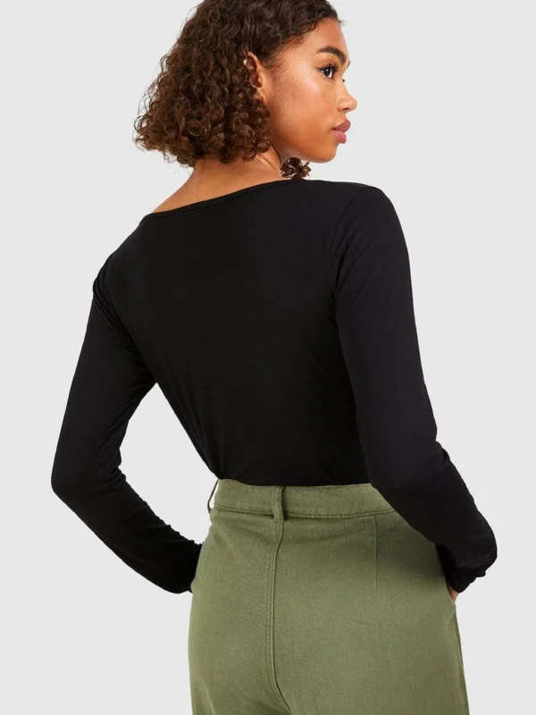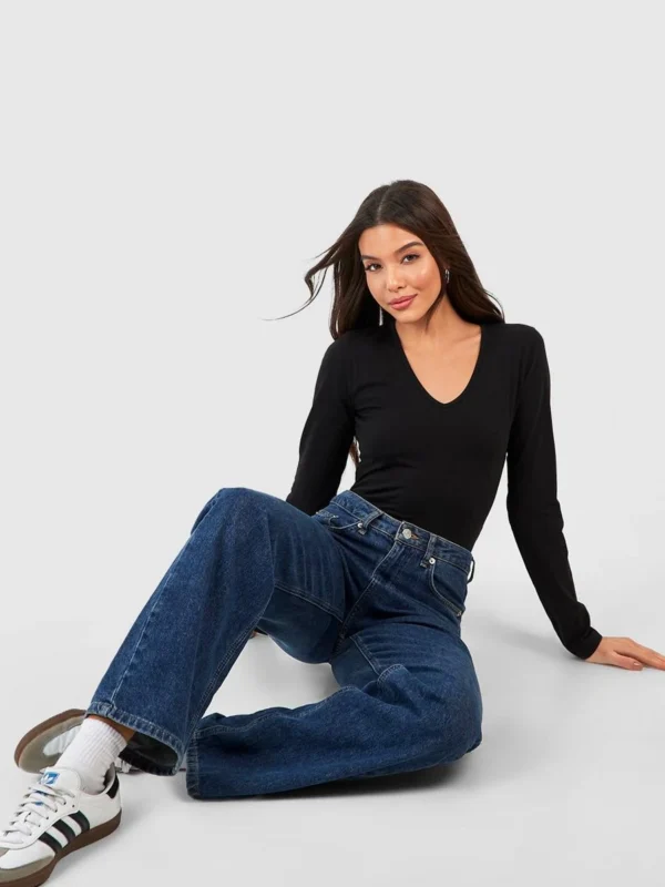 BOOHOO Black Long Sleeve V Neck Cotton Blend Bodysuit