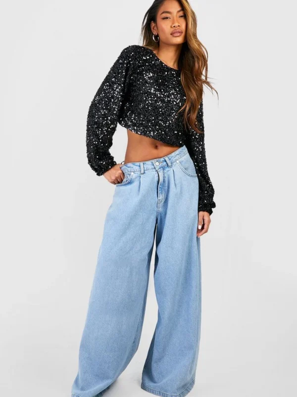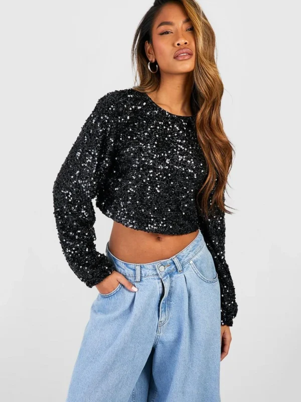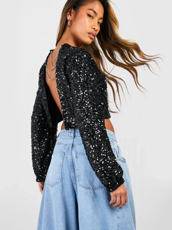 BOOHOO Black Sequin Chain Back Detail Long Sleeve Top
