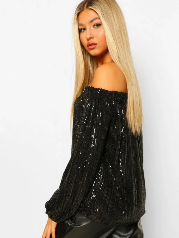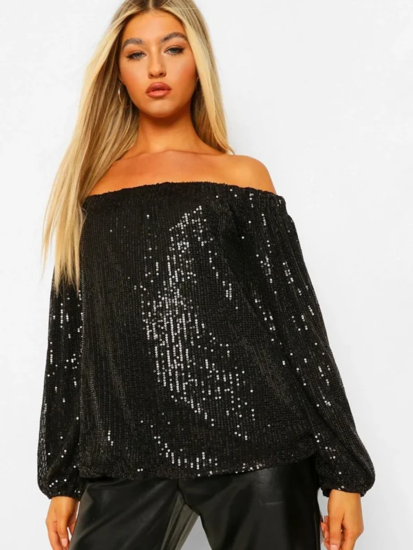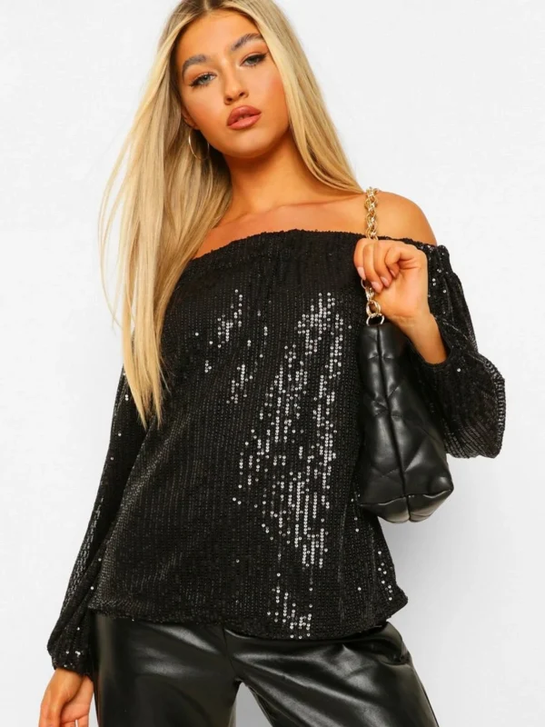 BOOHOO Black Tall Sequin Bardot Long Sleeve Top