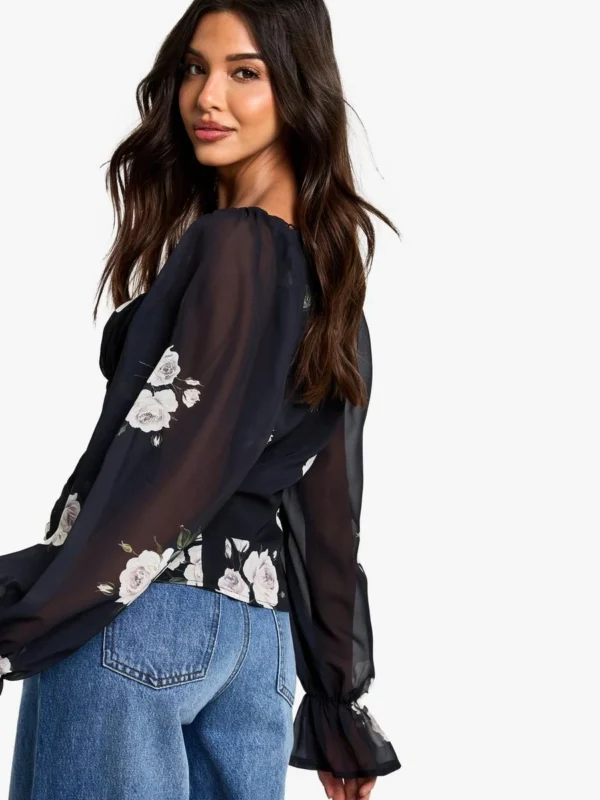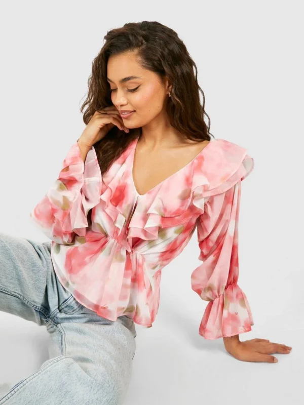 BOOHOO Blurred Floral Chiffon Ruffle Blouse