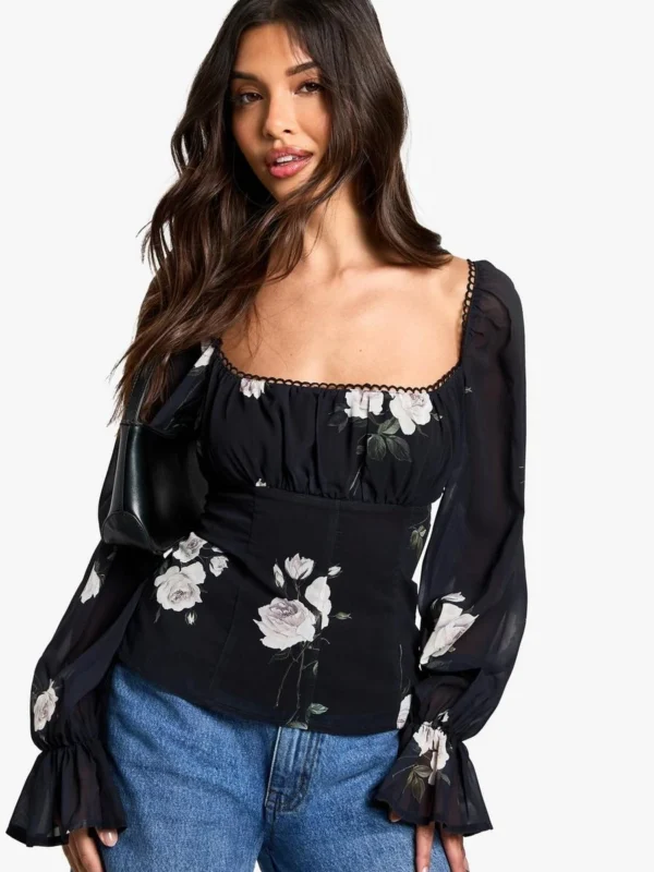 BOOHOO Blurred Floral Print Ruched Corset Bust Woven Blouse