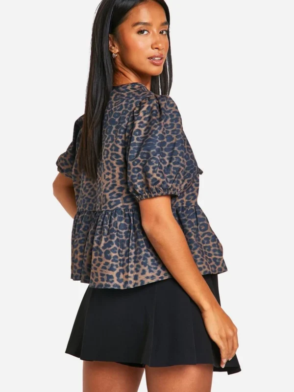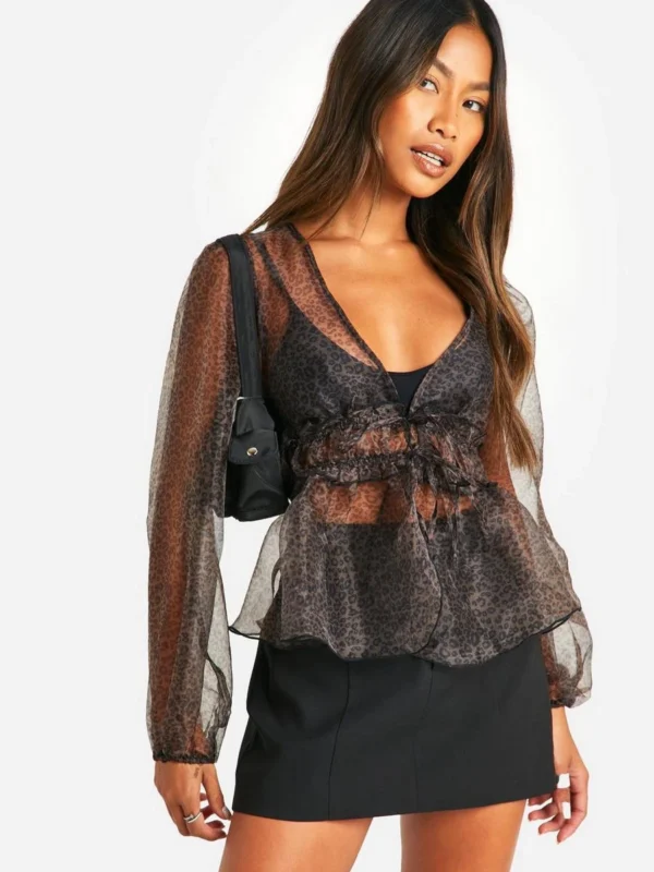 BOOHOO Micro Leopard Print Tie Volume Sleeve Blouse