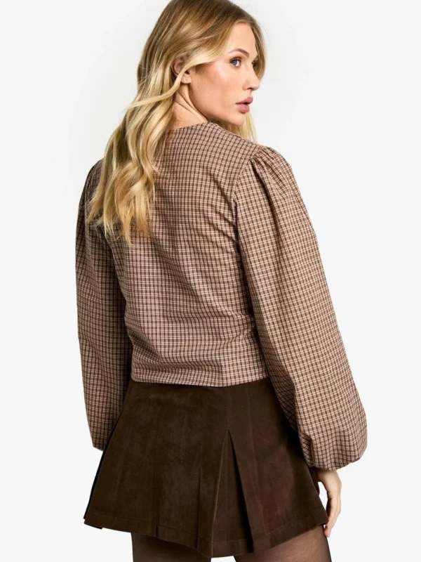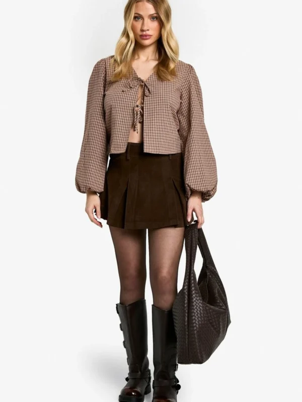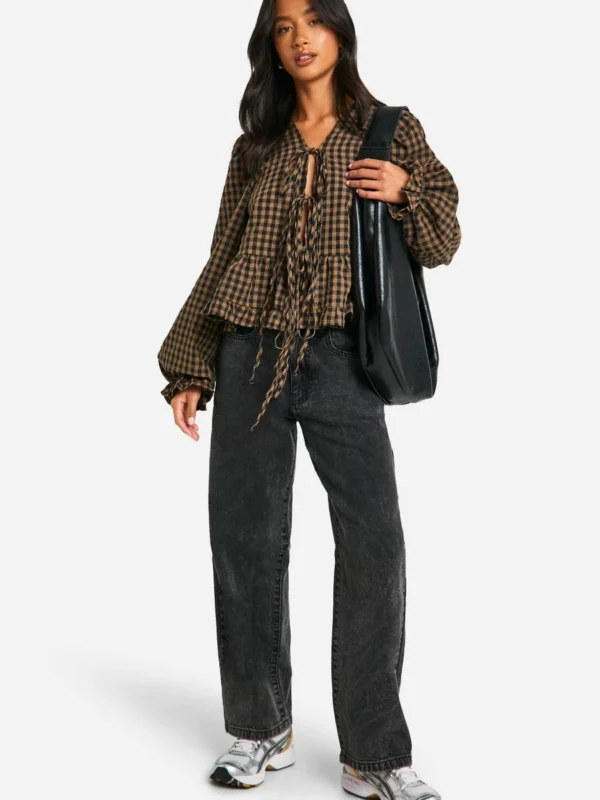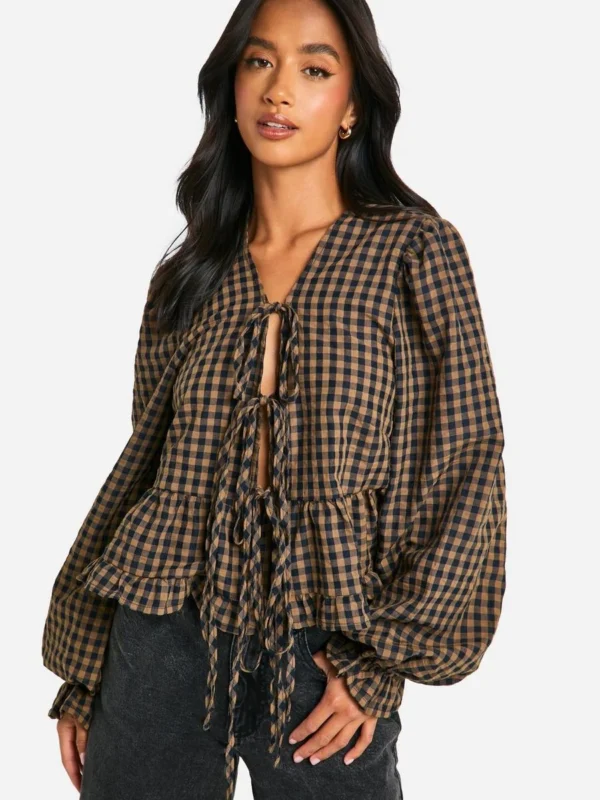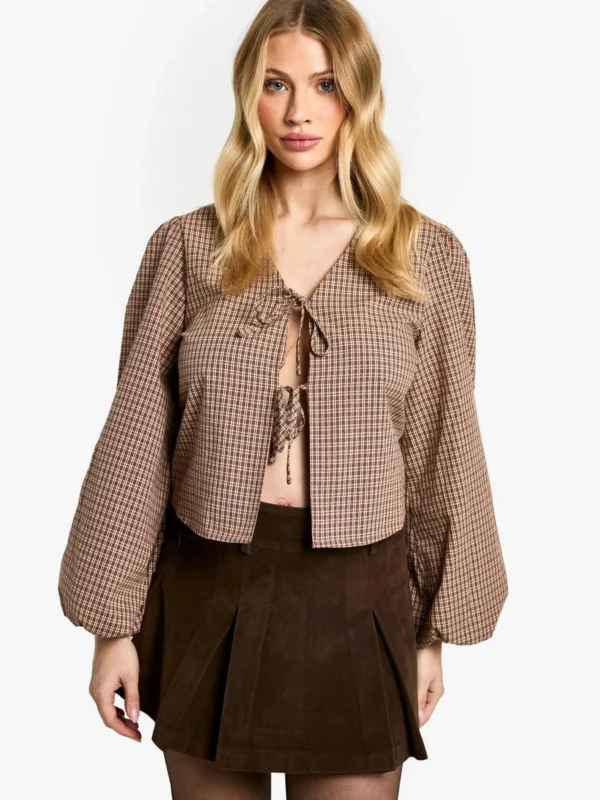 BOOHOO Maternity Woven Check Balloon Sleeve Tie Detail Top