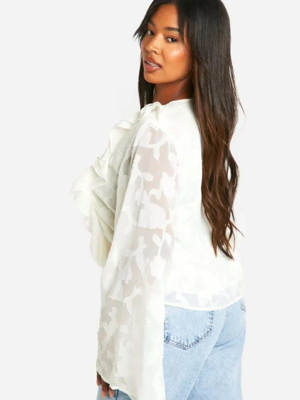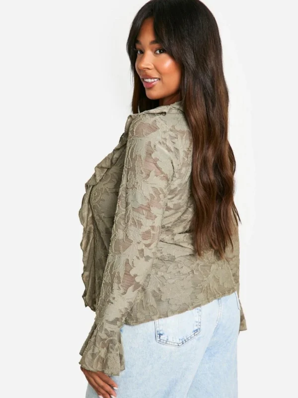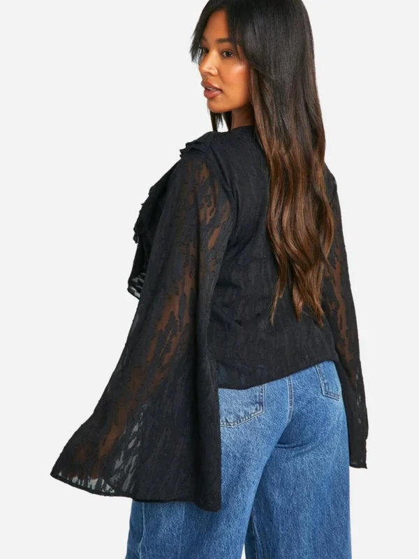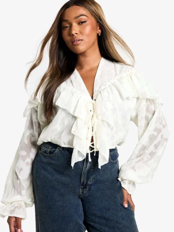 BOOHOO Plus Burnout Lace Up Ruffle Cuff Blouse