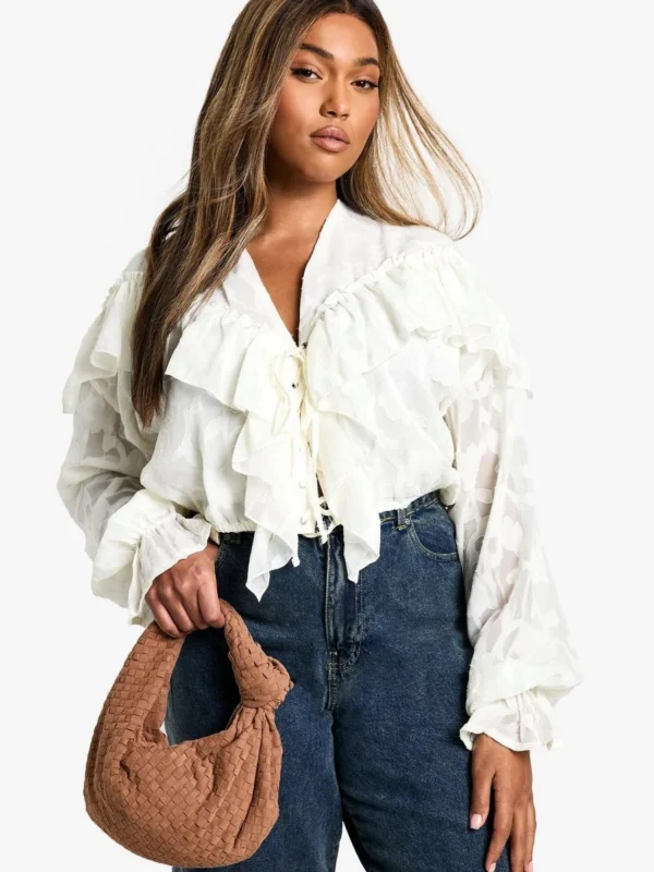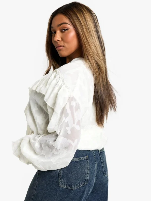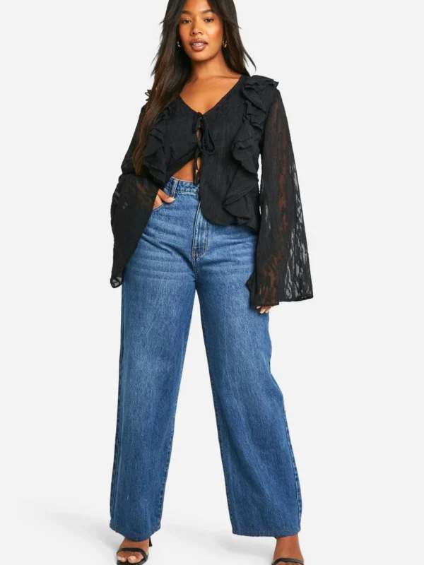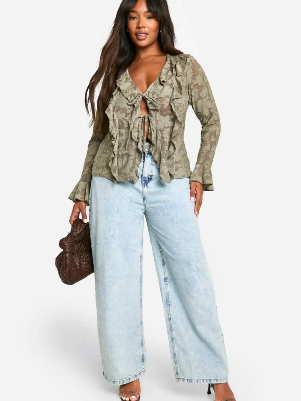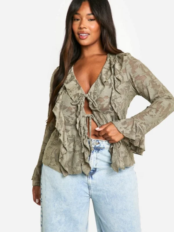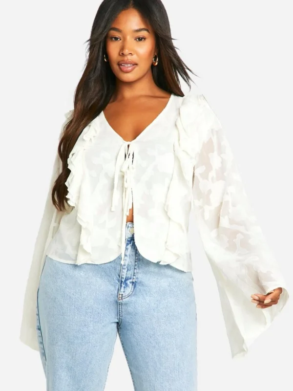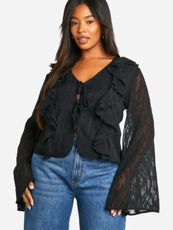 BOOHOO Plus Burnout Double Ruffle Tie Front Blouse