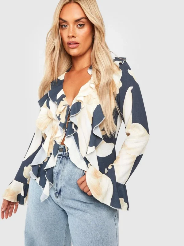 BOOHOO Plus Floral Double Ruffle Frill Blouse