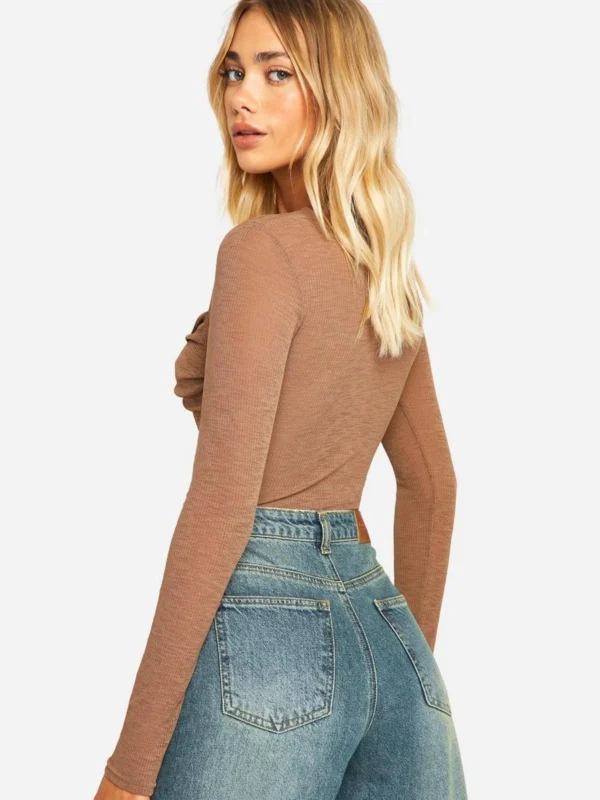 BOOHOO Sheer Rib Twist Front Long Sleeve Top