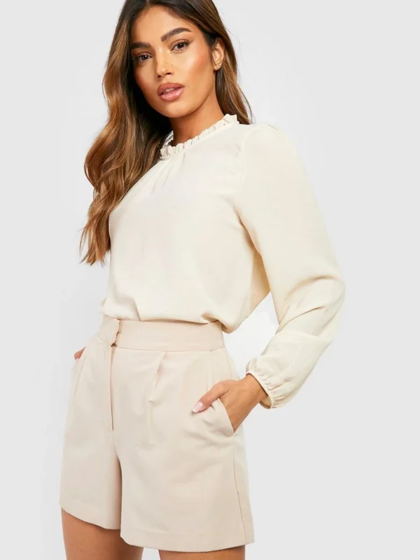 BOOHOO Stone Frill Neck Long Sleeve Woven Blouse